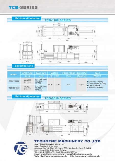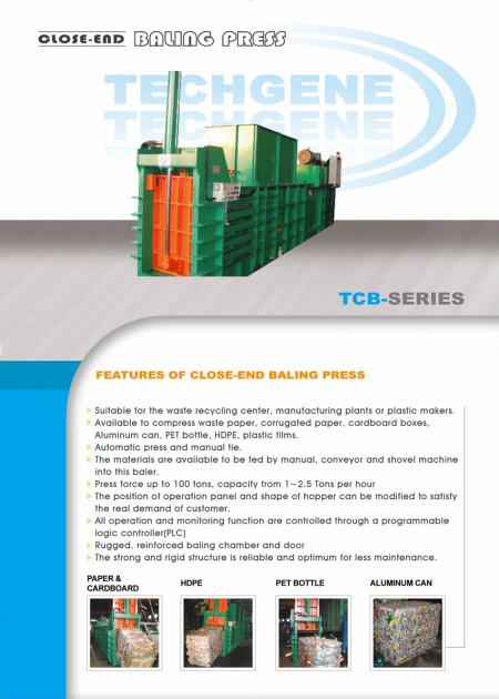 TCB-110850 Close-End Baler.To meet the requirement of waste recycling center,various materials can be collected. Such as waste papers, cardboards, carton boxes, Aluminum cans, PET bottles, HDPE, plastic films, foams...etc.The materials are available to be fed by manual, conveyor and shovel machine into our baler.To ensure our customers have the right baler for their needs Techgene have developed variants of our tried and tested Close -End baler TCB series.The <strong>TCB-110850</strong>,with its exceptionally large loading aperture is the perfect machine for compressing large quantities of paper,cardboard,carton boxes, Aluminum cans, PET bottles, HDPE, plastic films, foams,foils or packaging material and for extremely large and bulky materials.With a powerful 37 kW drive and manual tie with 4 steel wires.The <strong>TCB-081050</strong> has been especially designed for compressing strongly expanding material such as foam or PET bottle wih air inside.With a powerful 37 kW drive and manual 5-fold strapping with steel wires,this machine is perfect for compressing difficult materials. Of course,other packaging materials can also be compressed.The position of operation panel and shape of hopper can be modified to satisfy the real demand of operation for every customer.
