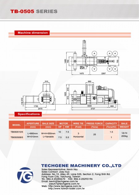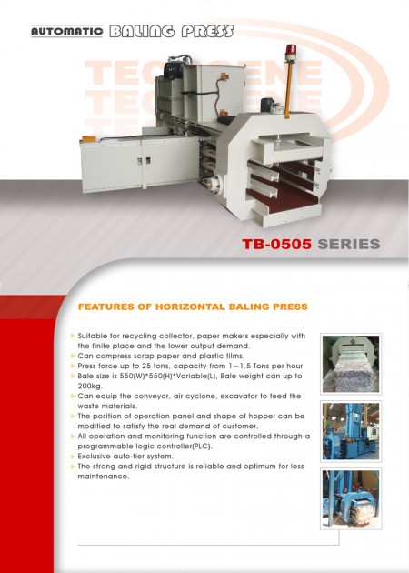 Dòng TB-050510 có thể nén giấy thủy tinh hoặc phim nhựa đã nát. Nó được cấu thành bởi động cơ 10HP (7.5KW), piston 125mm, lực ép 25 tấn, và công suất là 1.5 tấn mỗi giờ. Nó được thiết kế cho các nhà sản xuất giấy khác nhau với nhà máy nhỏ và nhu cầu công suất thấp. TB-050510 được chế tạo với cơ thể cứng cáp giúp nó rất bền bỉ. Ngoài ra, nó còn có sức mạnh mạnh mẽ bao gồm đơn vị thủy lực, xi lanh và căng cổ 3 chiều để nén giấy thải lỏng thành bao gọn chặt chẽ.